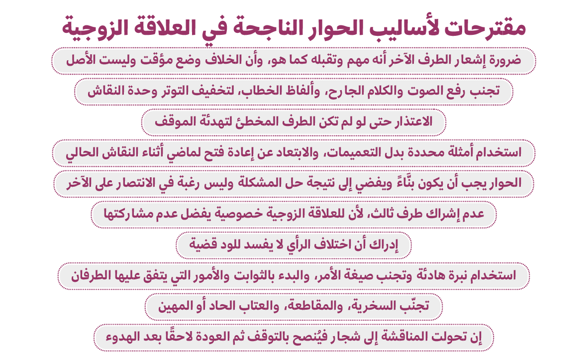 » تجنّب السخرية، والمقاطعة، والعتاب الحاد أو المهين. وإن تحولت المناقشة إلى شجار فيُنصح بالتوقف عن النقاش ثم العودة للحديث لاحقًا بعد هدوء النفوس وانخفاض حدة النقاش.