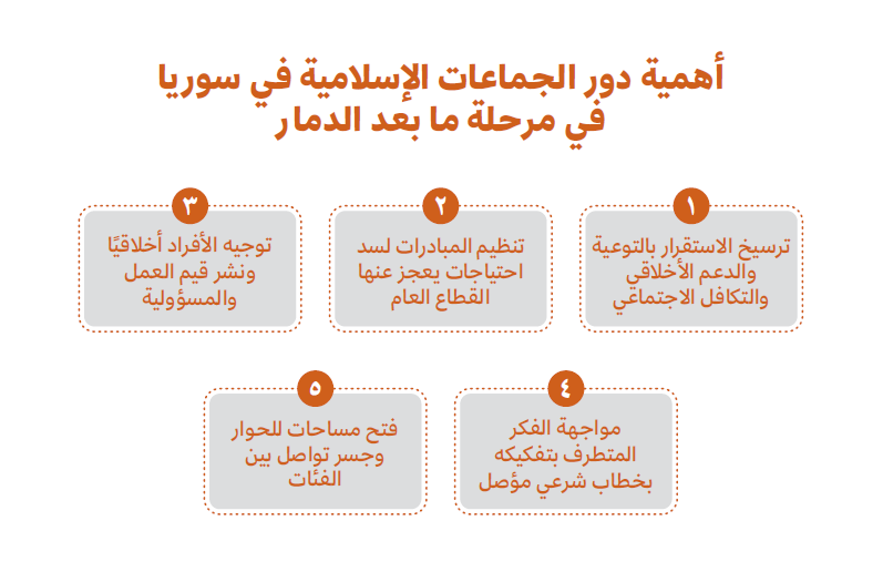 ورغم ذلك تبرز الحاجة لمثل هذه الجماعات أكثر في سوريا اليوم بعد الدمار الهائل الذي تركه النظام البائد، ليس فقط في العمران والاقتصاد إنما في الأخلاق والهوية والقيم الجامعة الرافعة. هذه الجماعات والتجمعات يمكن أن تكون سندًا للدولة ومعينًا للحكومة في مجالات عدة أهمها: