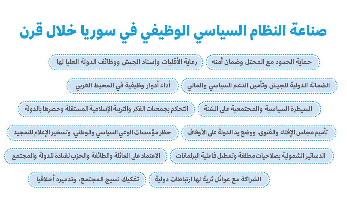 تسعى المقالة إلى بيان كيفية تشكّل (النظام السياسي) في سوريا خلال قرنٍ كاملٍ، بوصفه نظامًا وظيفيًا مندمجًا في المنظومة الدولية أكثر من كونه تعبيرًا عن إرادة المجتمع السوري. وذلك عبر تتبّع الأرضيات التي وضعتها قوى الانتداب كي تفرز النظام لا سيما بعد الاستقلال، وطريقةَ إدارة المجتمع والحدودِ والموارد وفق متطلبات القوى الدولية، ما يشير إلى دروسٍ وقائيةٍ للأجيال القادمة.